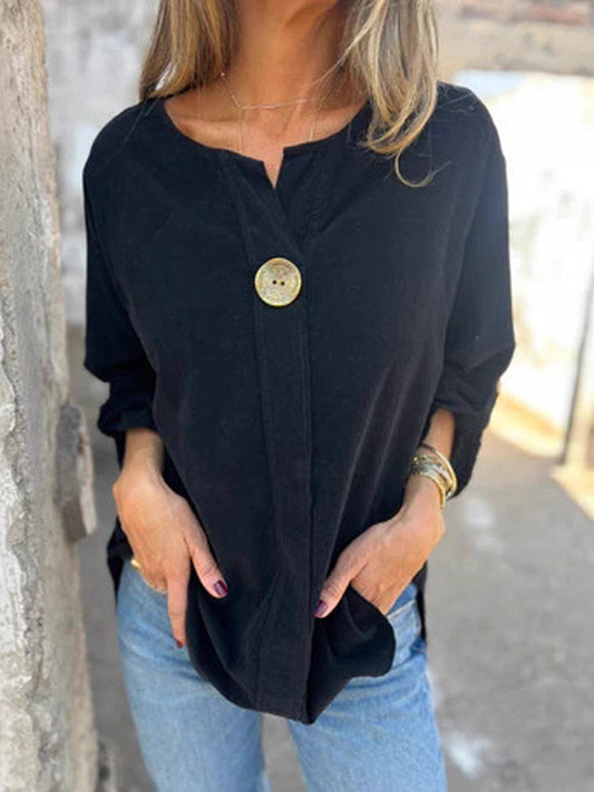 Жените реколта corduroy v-врата с дълги ръкави отгоре