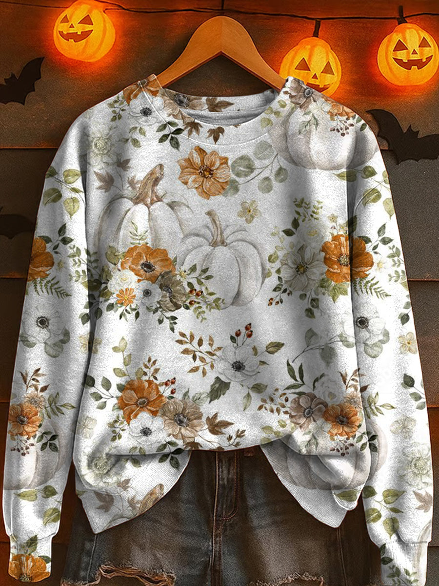 Благодарност тиква флорален печат екипаж врата хлабав суитчър