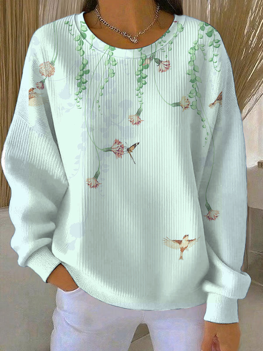Дамска светло зелена суитчър с висящ флорален и птичи мотив