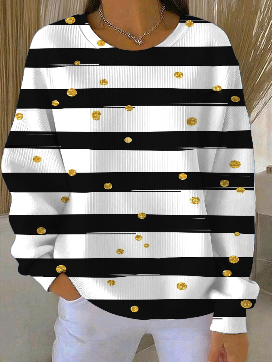 Дамска стилна черно-бяла ивица & златна точка суитчър