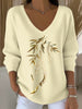 Дамски бляскава крем v-врата пуловер с лъскави златни листа пайети