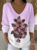 Дамски великолепен розово-бял градиент v-neck пуловер с изящни лилави флорални мъниста