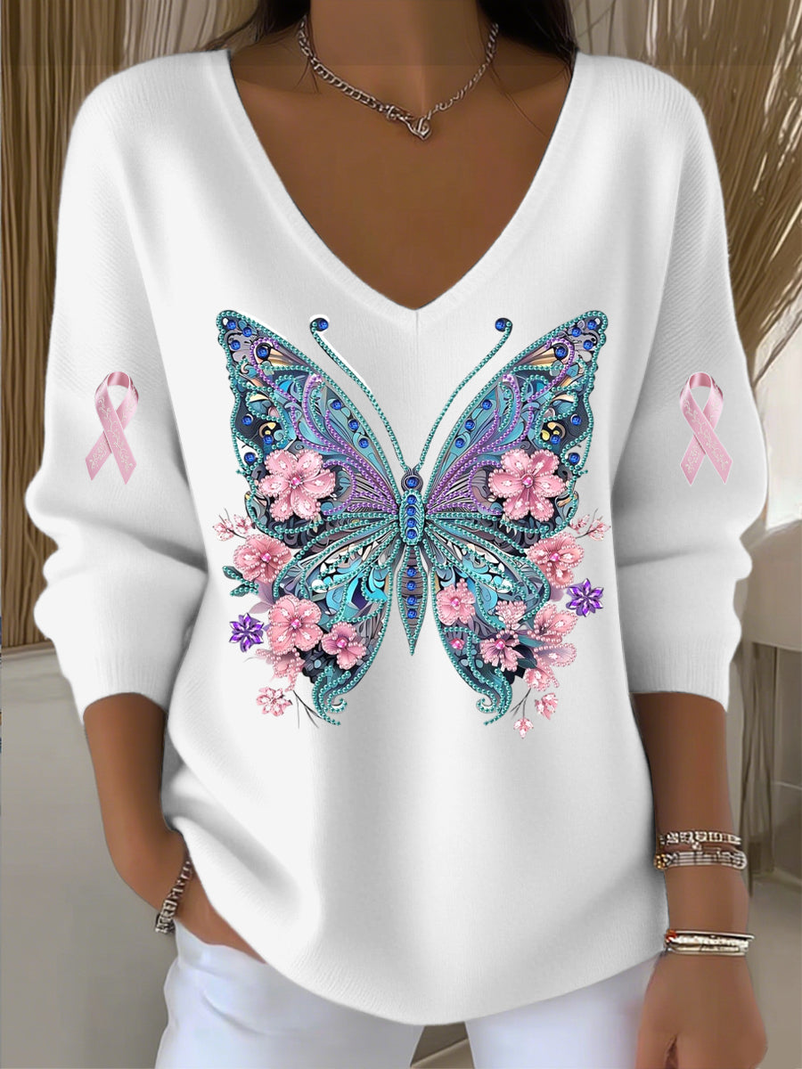 Дамски европейски стил бял v-врат пуловер с очарователна пеперуда бродерия, модерен и удобен, лесен за създаване на дневен външен вид