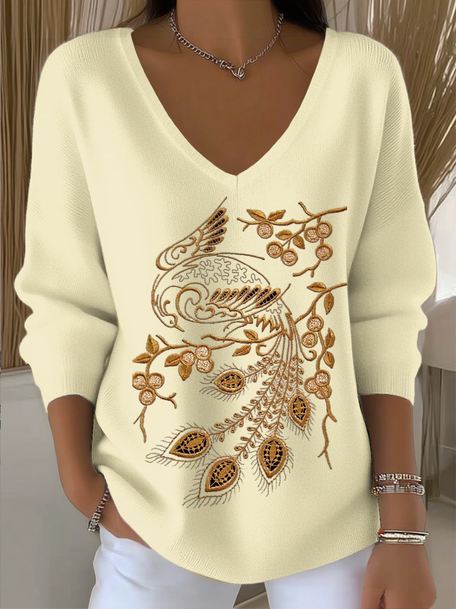 Дамски европейски стил светло жълт пуловер v-neck, украсен с изящна бродерия на паун, проста и атмосферна, представяща стил в ежедневното облекло