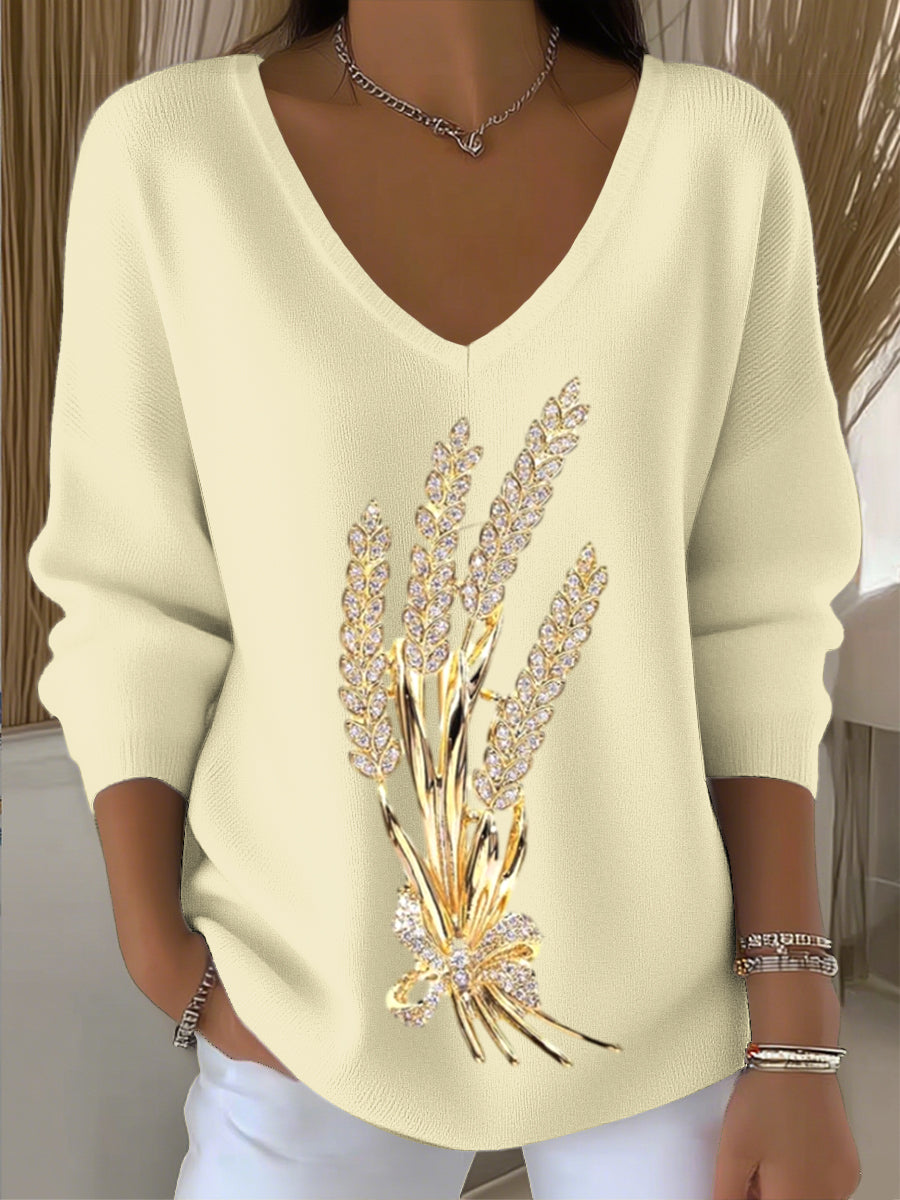 Дамски европейски стил светло жълт v-neck пуловер с проста и модерна флорална бродерия, модерна и удобна, лесна за контрол на ежедневното обличане