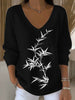 Дамски европейски стил черен v-врат пуловер с проста листна бродерия, модерен и удобен, лесен за създаване на дневен външен вид