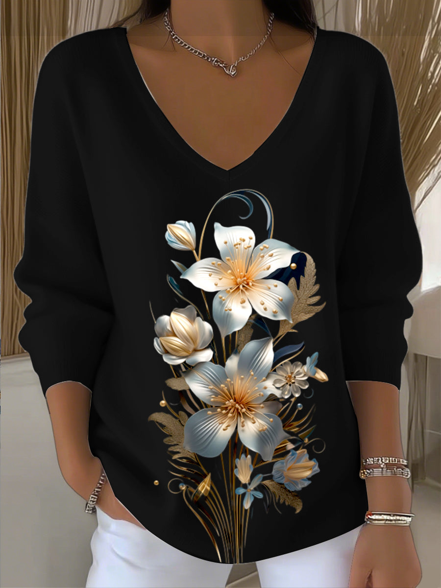 Дамски европейски стил черен v-neck пуловер, сдвоен с изящна флорална бродерия, модерна и топла, подходяща за ежедневни нужди за носене