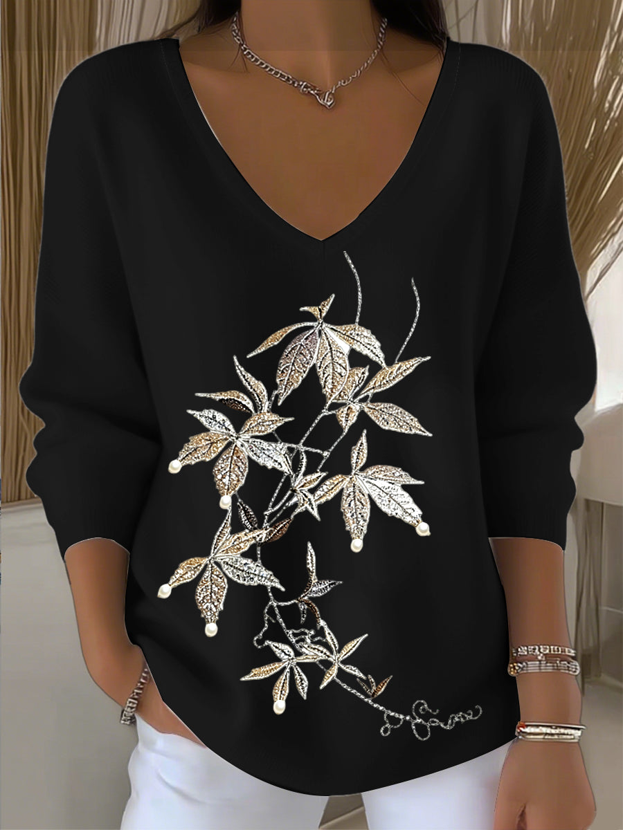 Дамски европейски стил черен v-neck пуловер с изящна и атмосферна листна бродерия, модерна и удобна, първият избор за зимата