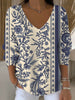 Дамски елегантен син флорален печат бежов v-врата отгоре