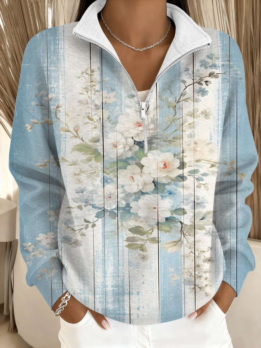 Дамски елегантен син флорален печат щанд-яка суитчър