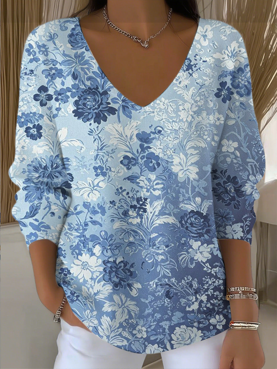 Дамски елегантен син флорален печат v-врата отгоре
