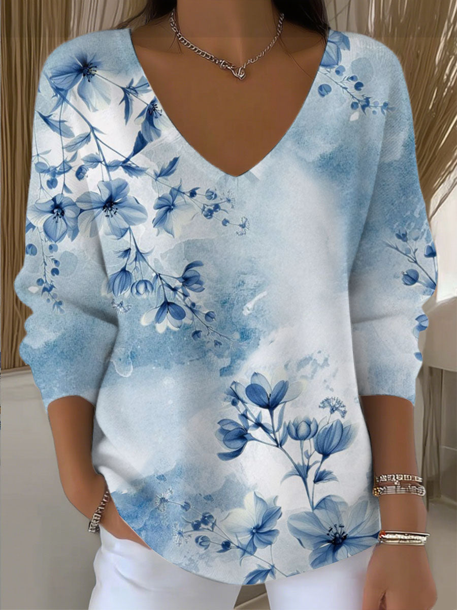 Дамски европейски стил бял v-врат пуловер с очарователна листна бродерия, модерен и удобен, лесен за създаване на дневен външен вид