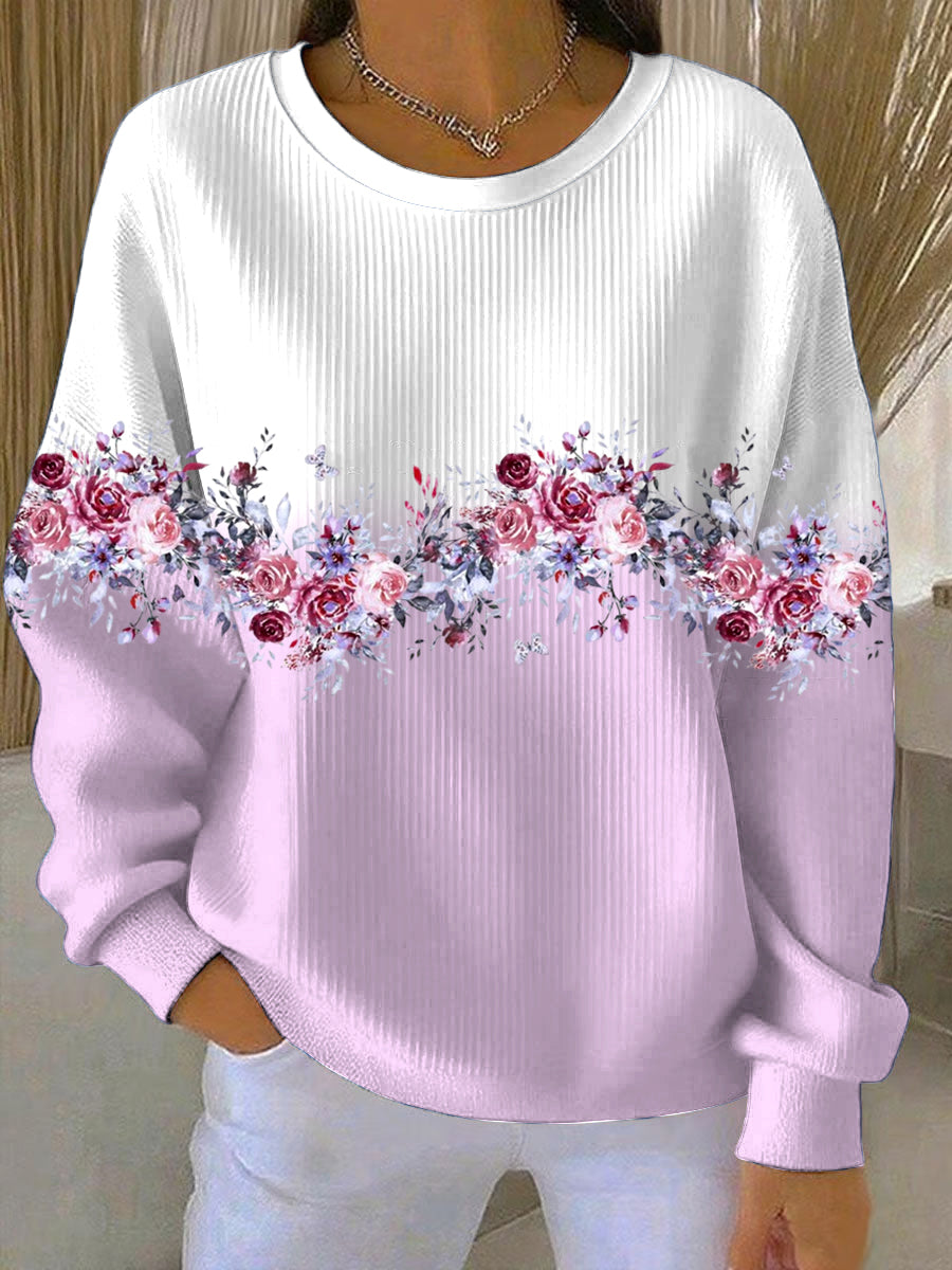 Дамски сладко розово-бял цвят-блок суитчър с флорален печат