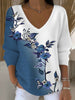 Дамски стилен синьо-бял градиент v-neck пуловер с елегантен син флорален печат