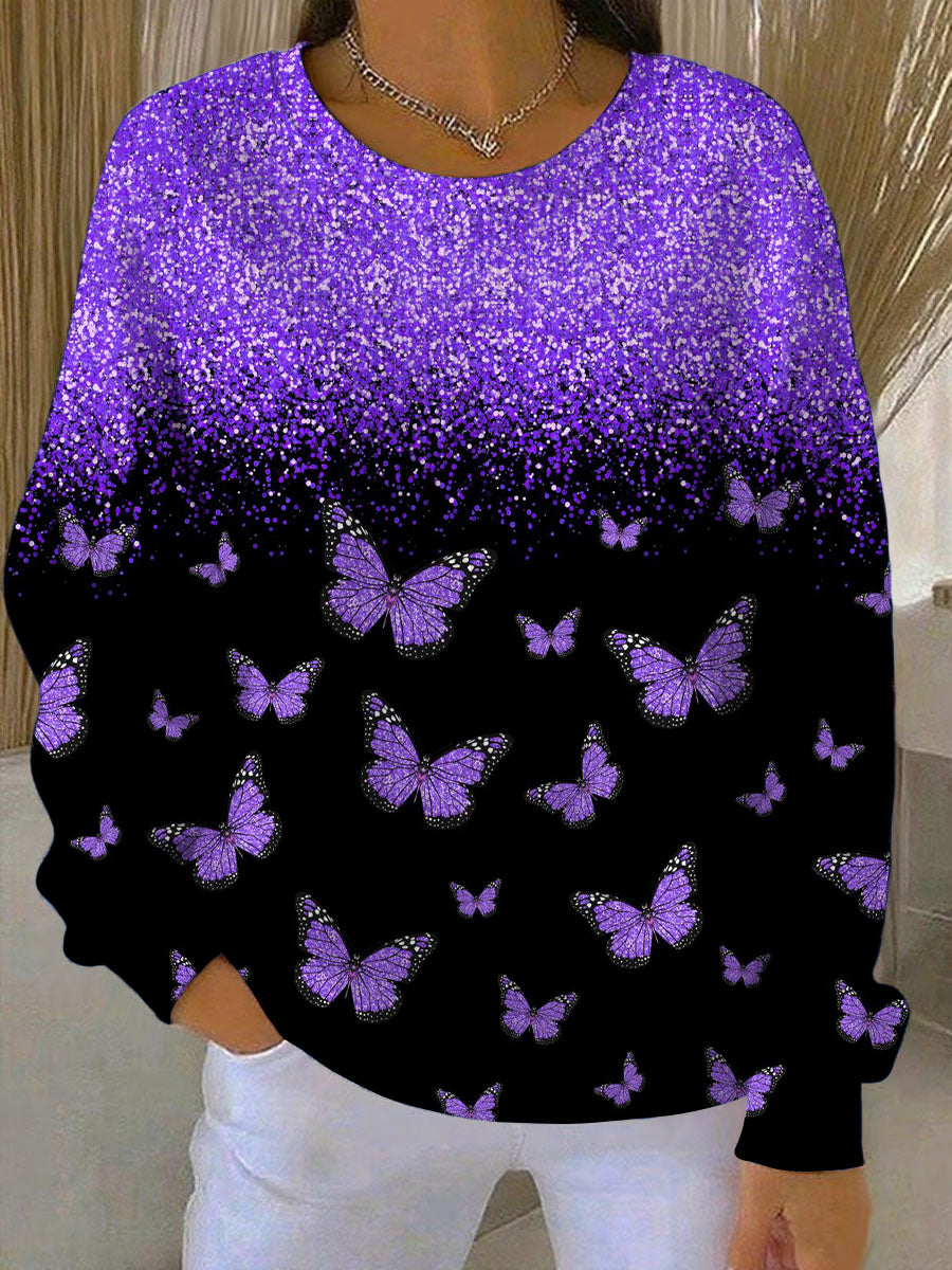 Жените блестящи лилаво пеперуда печат суитчър