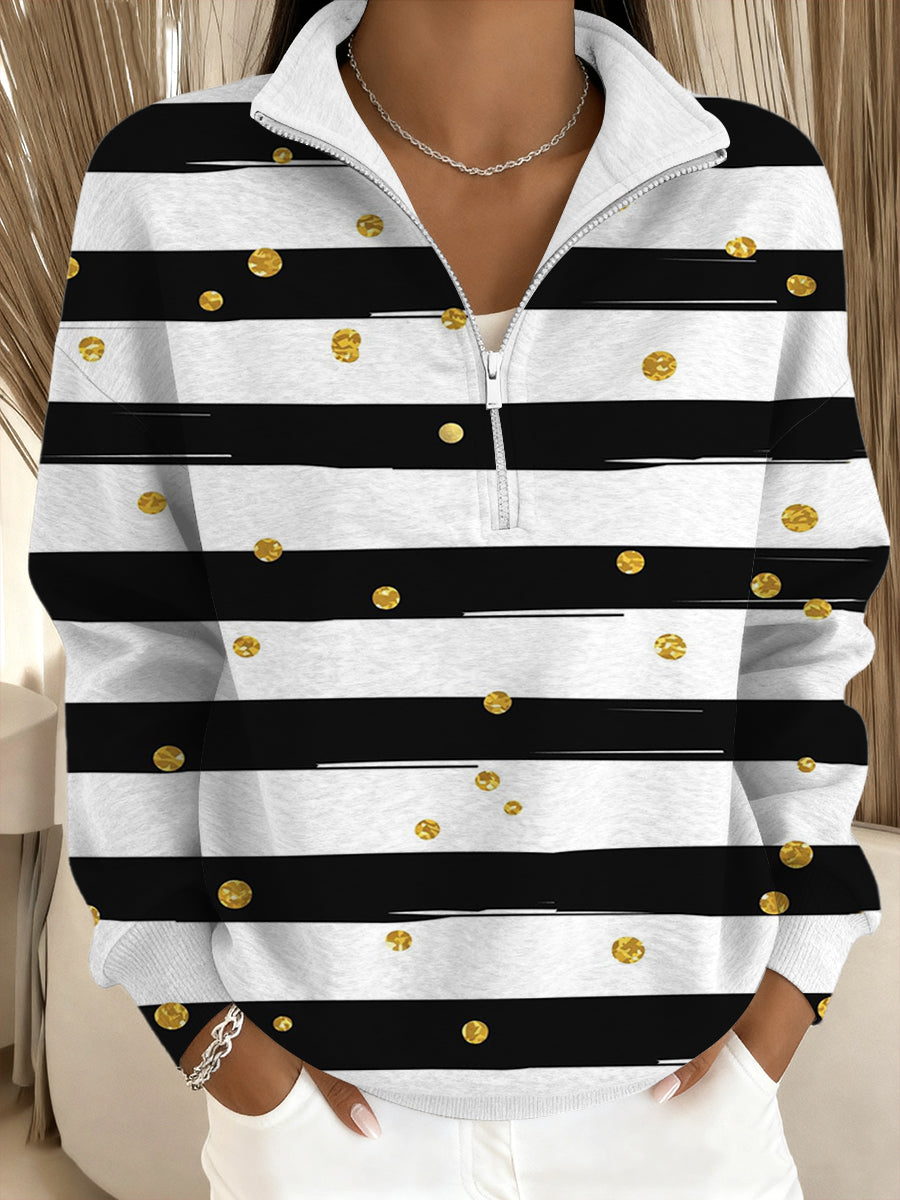 Жените бляскаво черно-бяло ивица & злато точка щанд яка суитчър