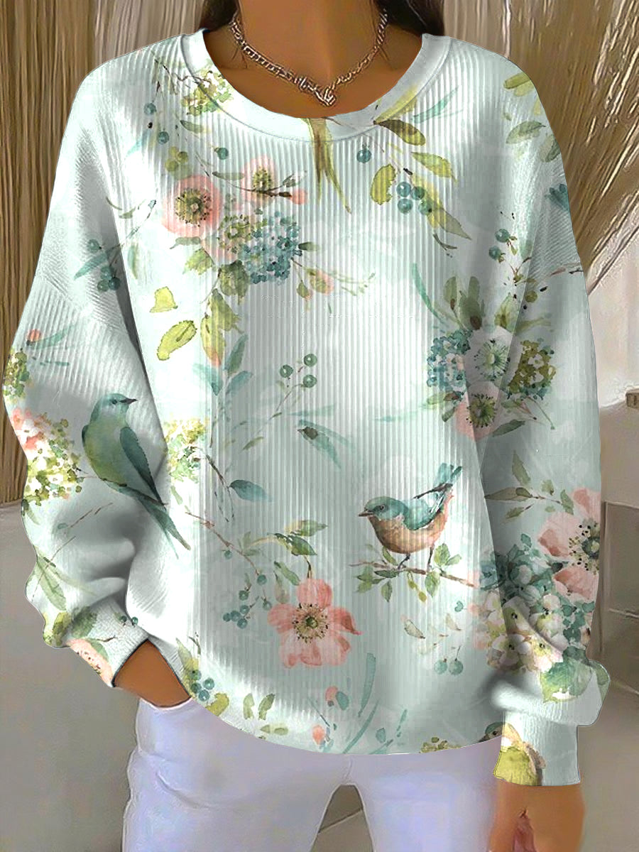 Жените реколта птица и флорални случайни екипаж врата пуловер