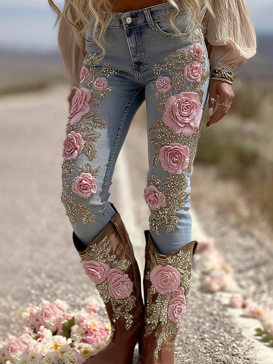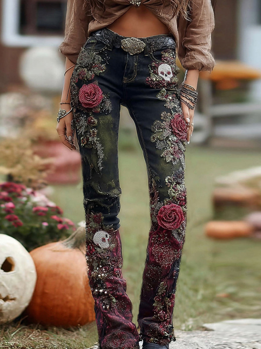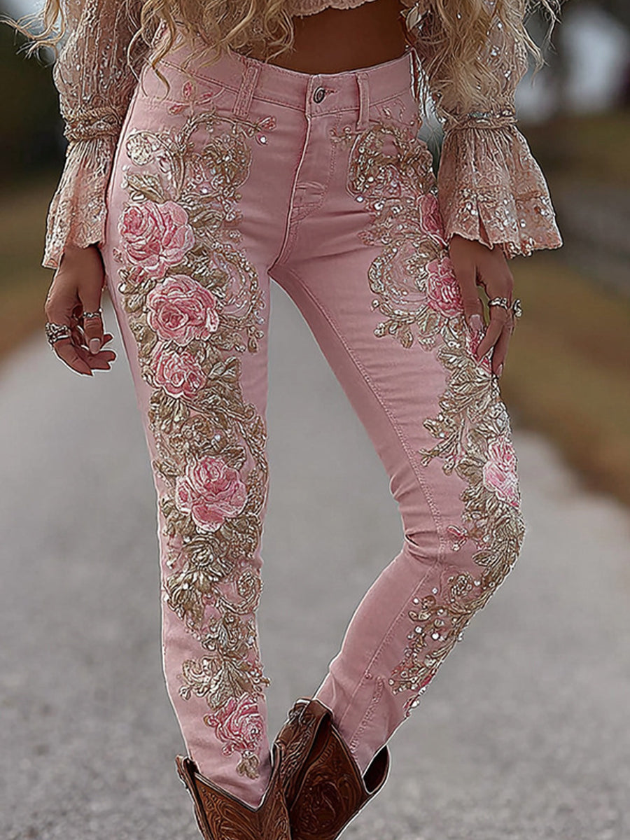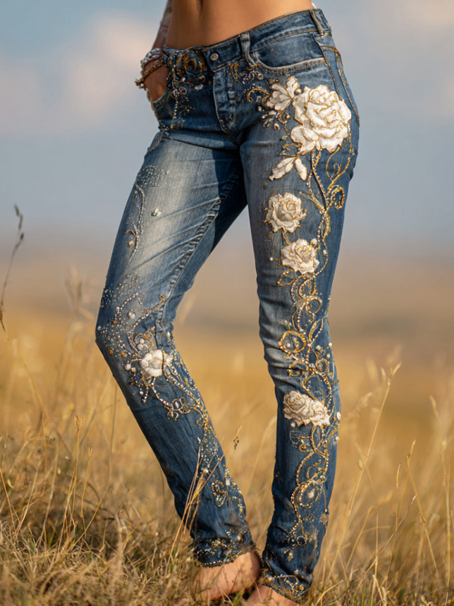 Дамски европейски стил бял v-врат пуловер с очарователна листна бродерия, модерен и удобен, лесен за създаване на дневен външен вид
