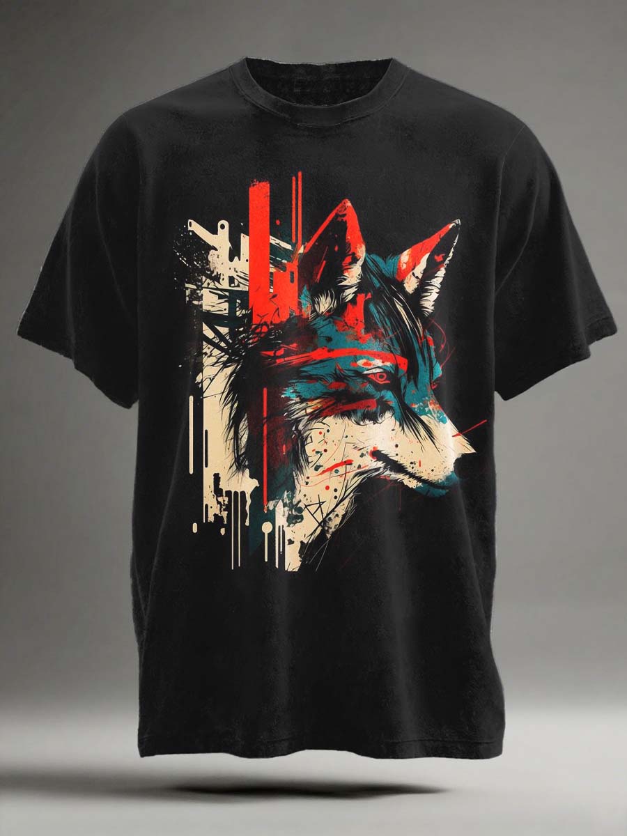 Реколта скандинавски вълк печат случайни къс ръкав тениска