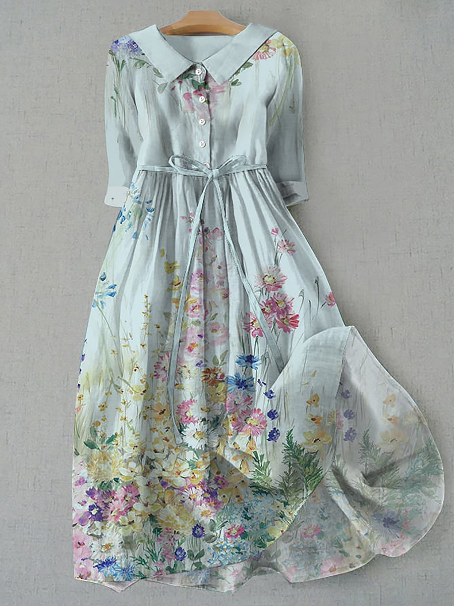 Ретро бохо цветен печат реколта шик обло врата бутон с дълъг ръкав midi рокля