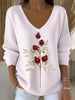 Дамски европейски стил светло розов пуловер v-neck, украсен с сладка и деликатна флорална бродерия, класически и удобен, подходящ за различни ежедневни сцени