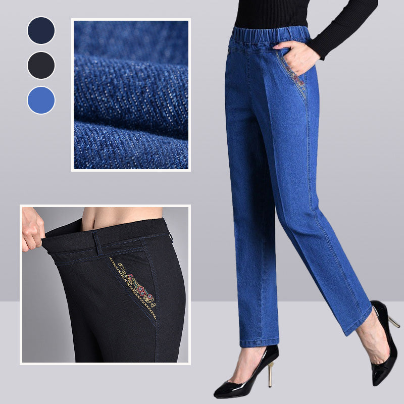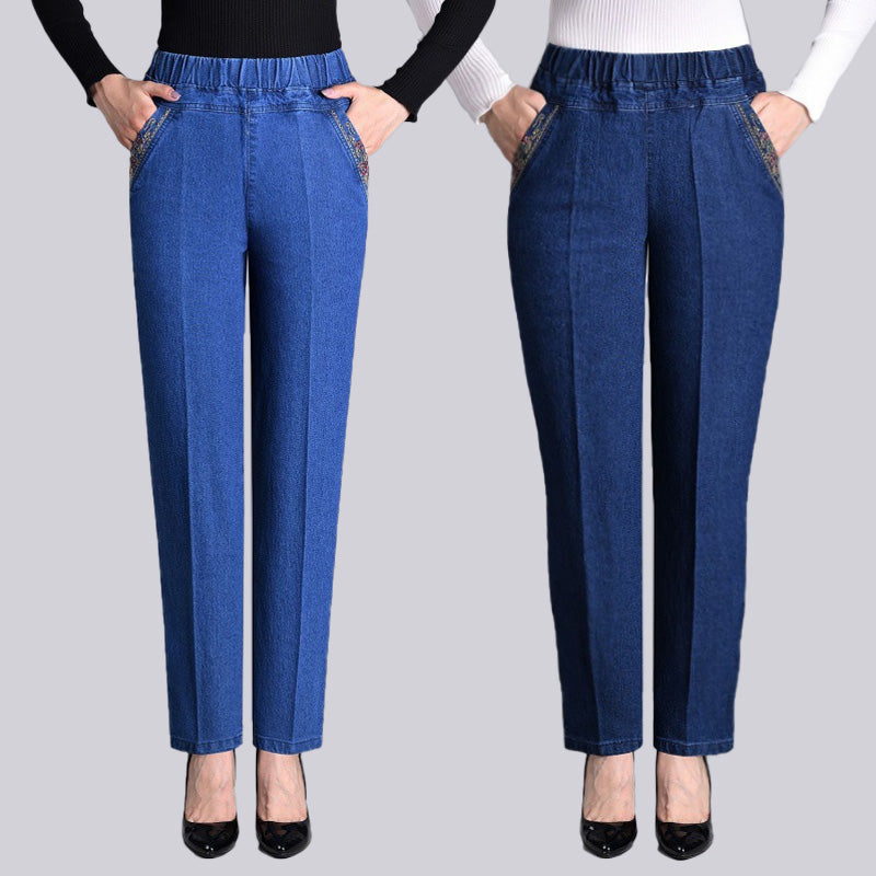 1 * Женски дънки със странични джобове и пълна еластична талия