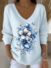 Дамски европейски стил светло син v-врат пуловер, украсен с елегантна флорална бродерия, класически и удобен, подходящ за различни ежедневни сцени