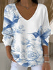 Дамски елегантен син колибри & роза v-врата пуловер